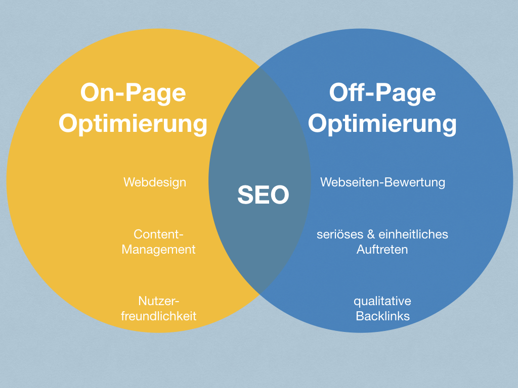 Grundsätzlich unterscheidet man zwischen den On-Page und den Off-Page Maßnahmen. Wie der Name es bereits erklärt, werden bei der On-Page Optimierung Inhalte bearbeitet, die sich direkt auf der entsprechenden Webseite befinden. Darunter gehört das Content-Marketing, das Webseiten-Design und die Nutzerfreundlichkeit der Seite, auch Usability genannt. Es ist zwar einerseits wichtig, dass eine Seite ansprechend gestaltet ist, jedoch sollte der Sinn und Zweck der Seite nicht vergessen werden. Es ist keinem Nutzer geholfen, wenn die Webseite schön aussieht, man sich jedoch nicht zurecht findet. Deshalb kann man die drei Bereiche nicht gewichten. Es kann nicht gesagt werden, welcher Bereich wichtiger ist und welcher eventuell weniger wichtig. Aber Fakt ist, die Seite muss nutzerfreundlich sein. Das ist das A&O - findet sich der Nutzer nicht zurecht, verlässt er die Seite innerhalb kürzester Zeit. Dies kann im schlimmsten Fall zu einem schlechten Ranking führen, da die Suchmaschinen erkennen, wie lange sich die jeweiligen Nutzer auf der Seite aufgehalten haben (= Verweildauer).